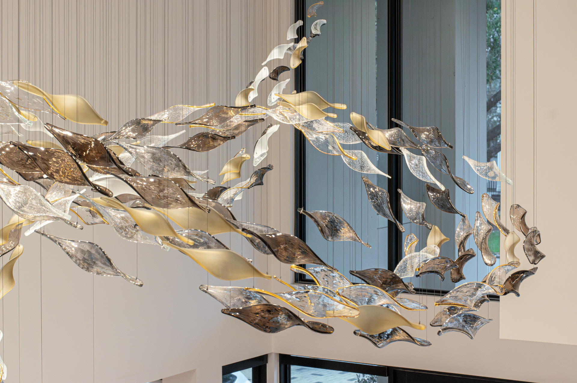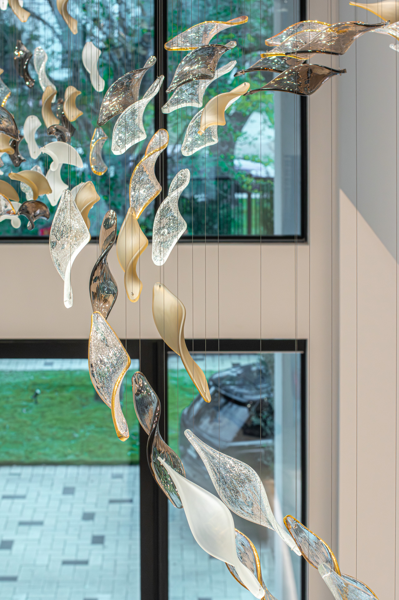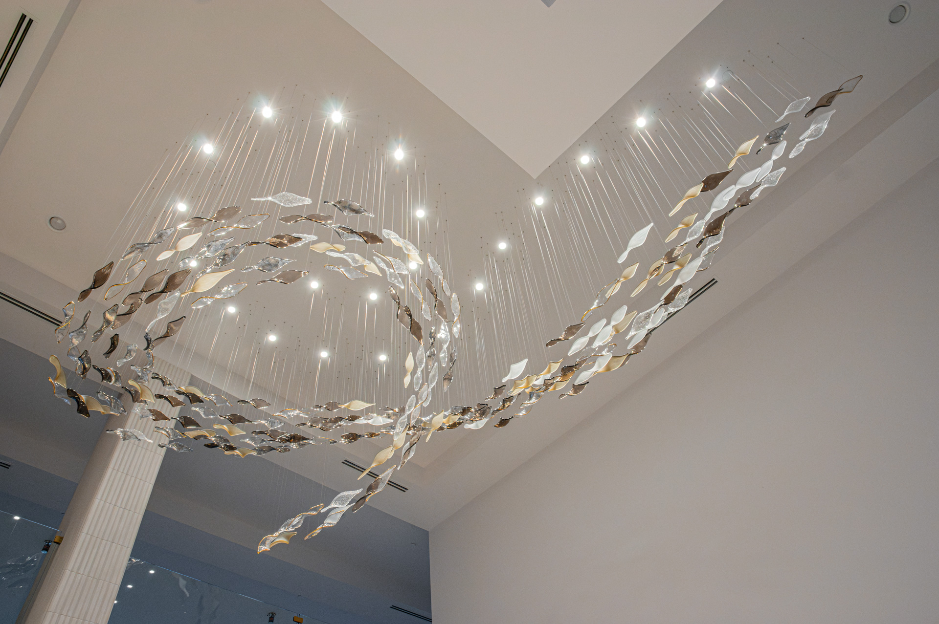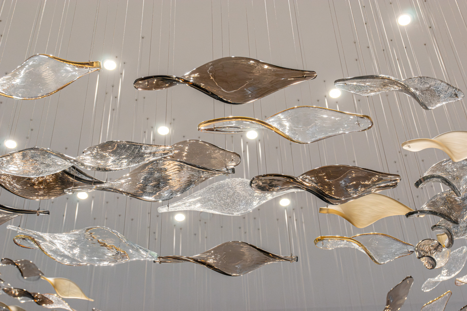 Hand-Crafted glass Ribbons by Blown cascade through a multi-story space, creating a floating sculpture of movement and light. Custom produced by Blown Design with lighting specified by Blown and integrated by others.