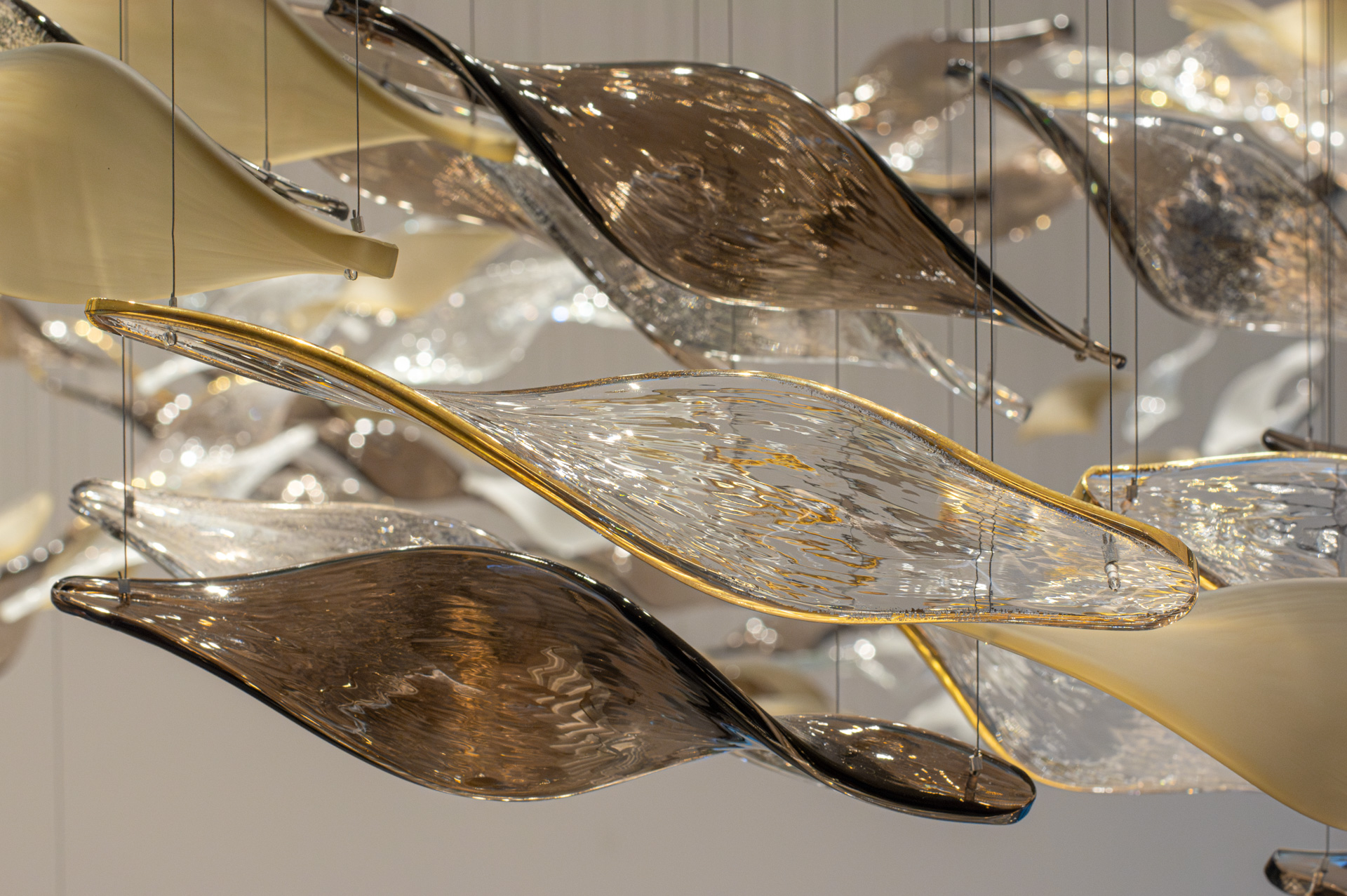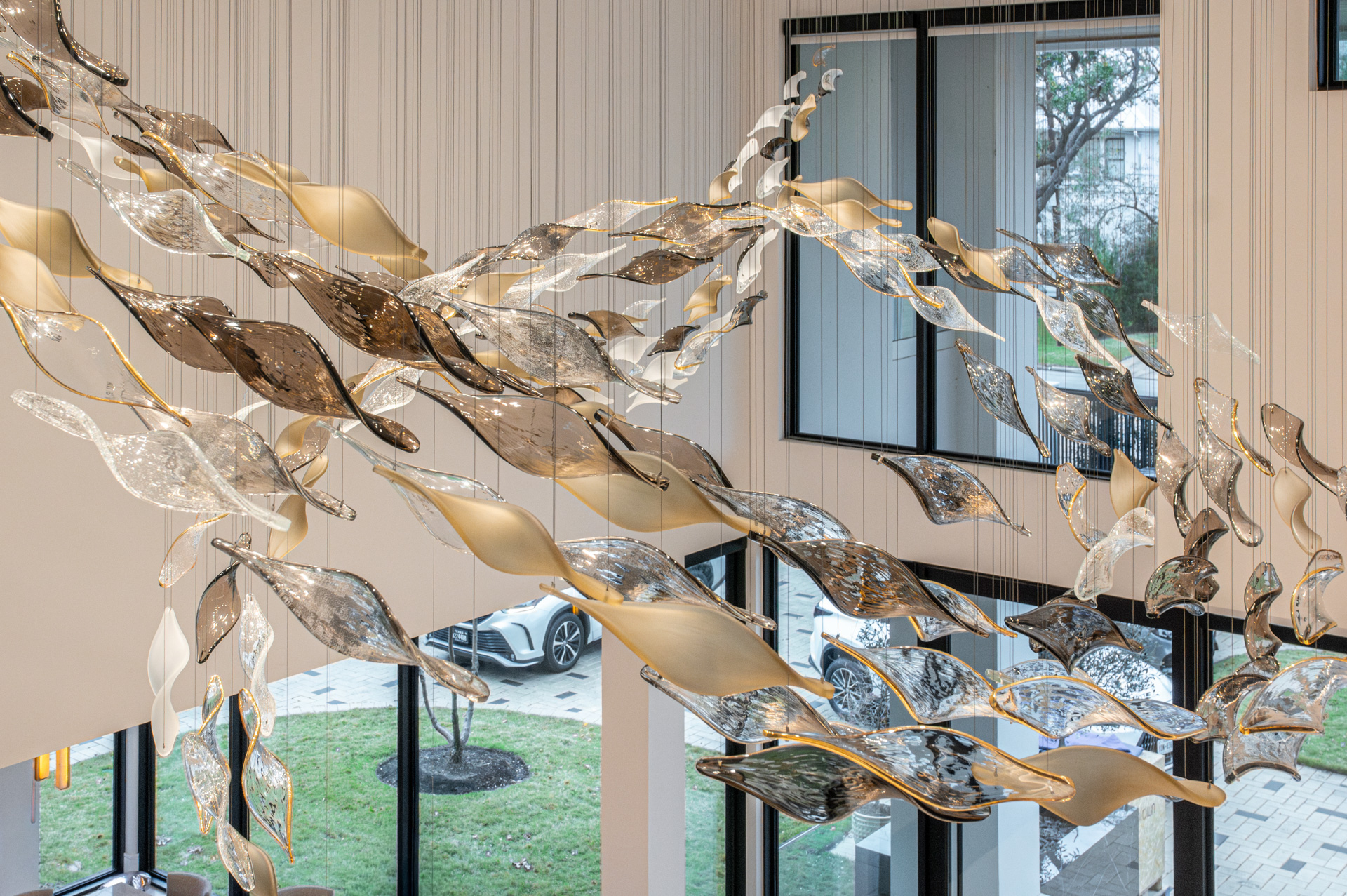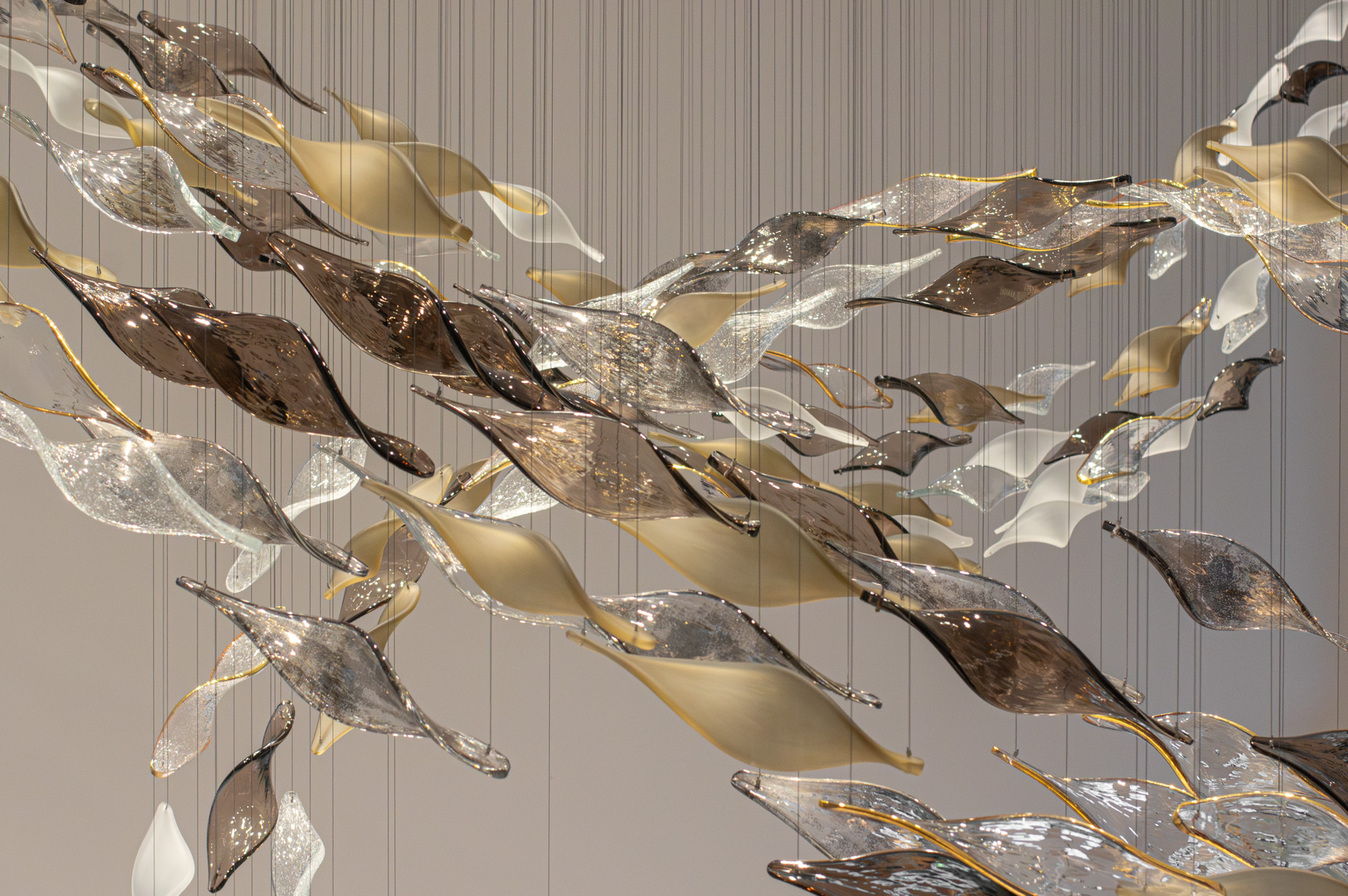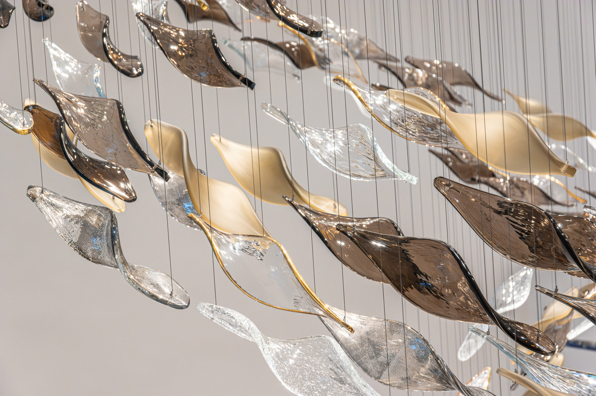 Hand-Crafted glass Ribbons by Blown cascade through a multi-story space, creating a floating sculpture of movement and light. Custom produced by Blown Design with lighting specified by Blown and integrated by others.