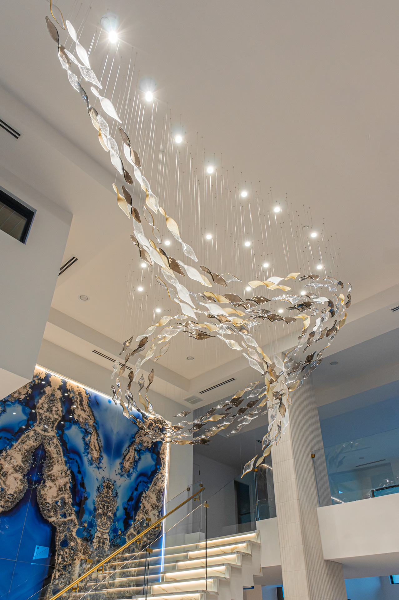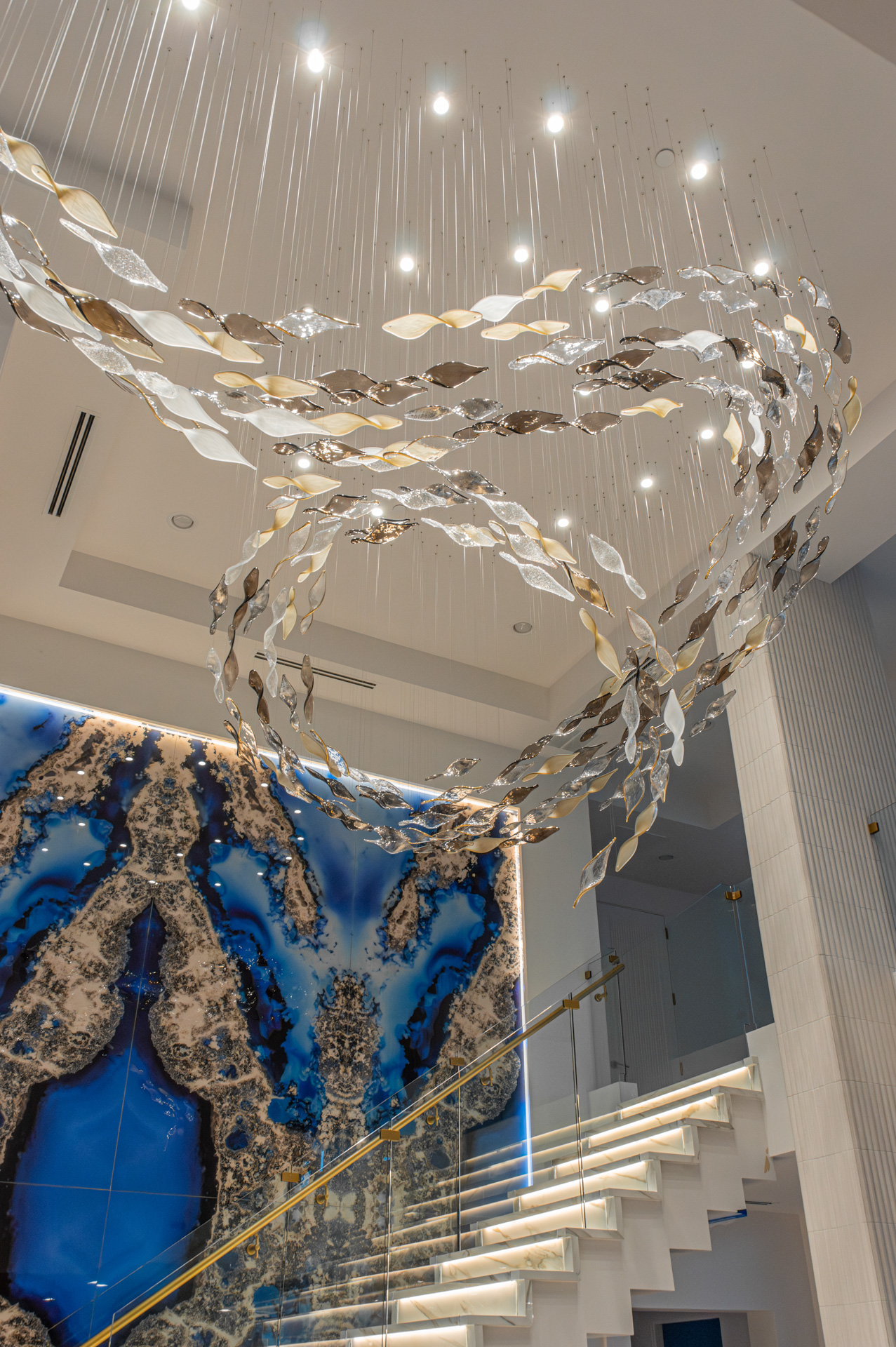 Inspired by fluid motion, the installation transforms this residential entry into a dynamic architectural centerpiece.